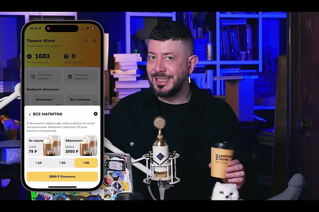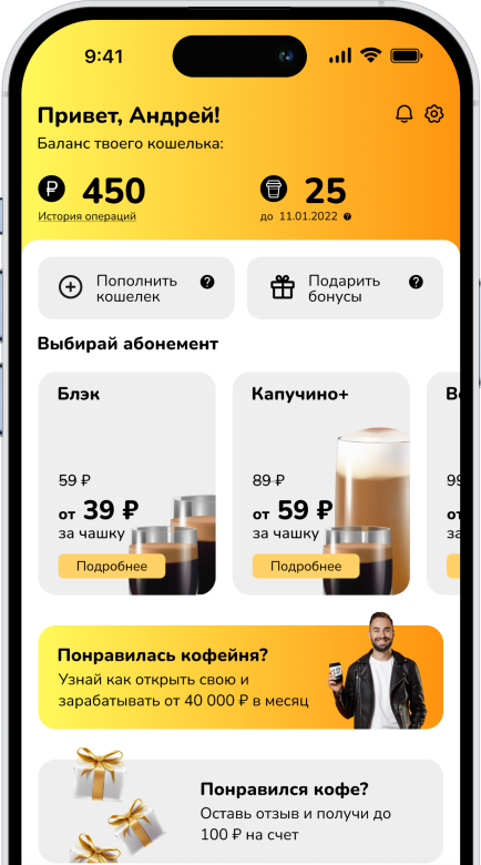 Для постоянных клиентов и сотрудников ближайших организаций. С каждой покупки вам возвращается 10%. Вы можете полностью оплатить чашку кешбэком или бесплатно угостить друга